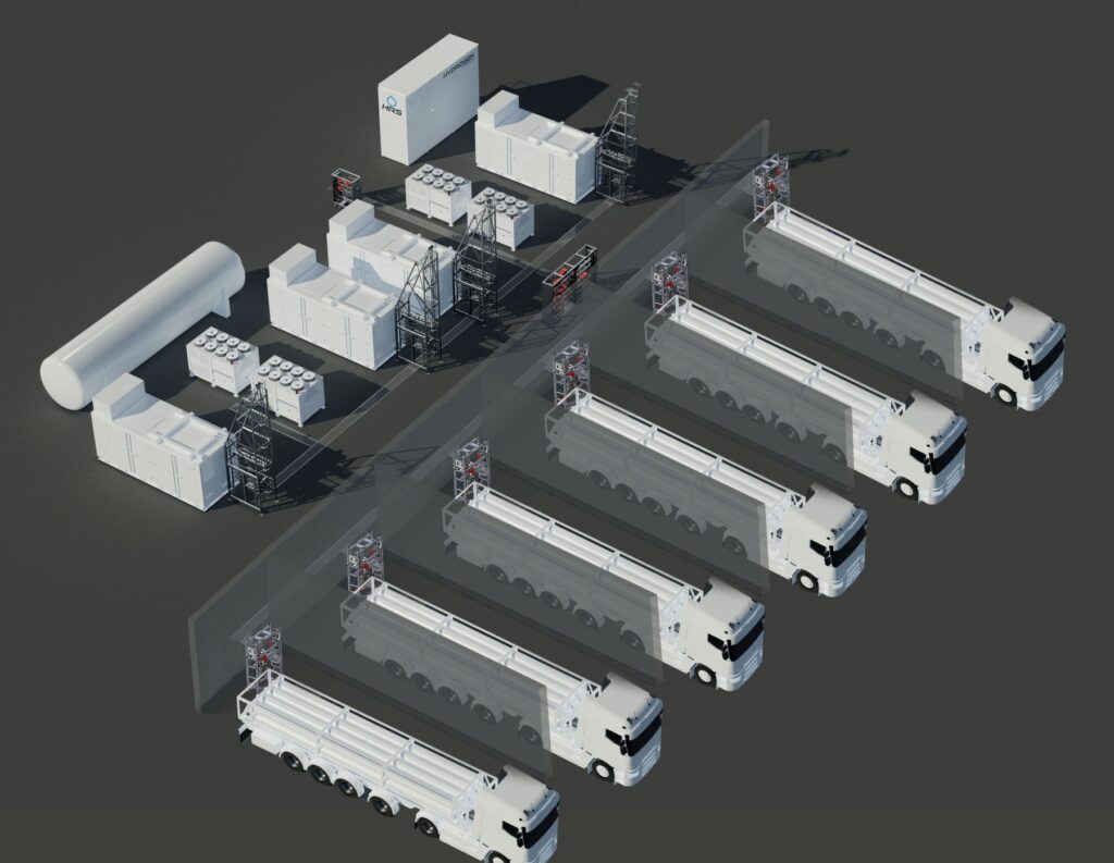 Pour accompagner les sites de production industrielle d’hydrogène, HRS développe la solution Filling Center pour le ravitaillement grande capacité des tubes trailers.